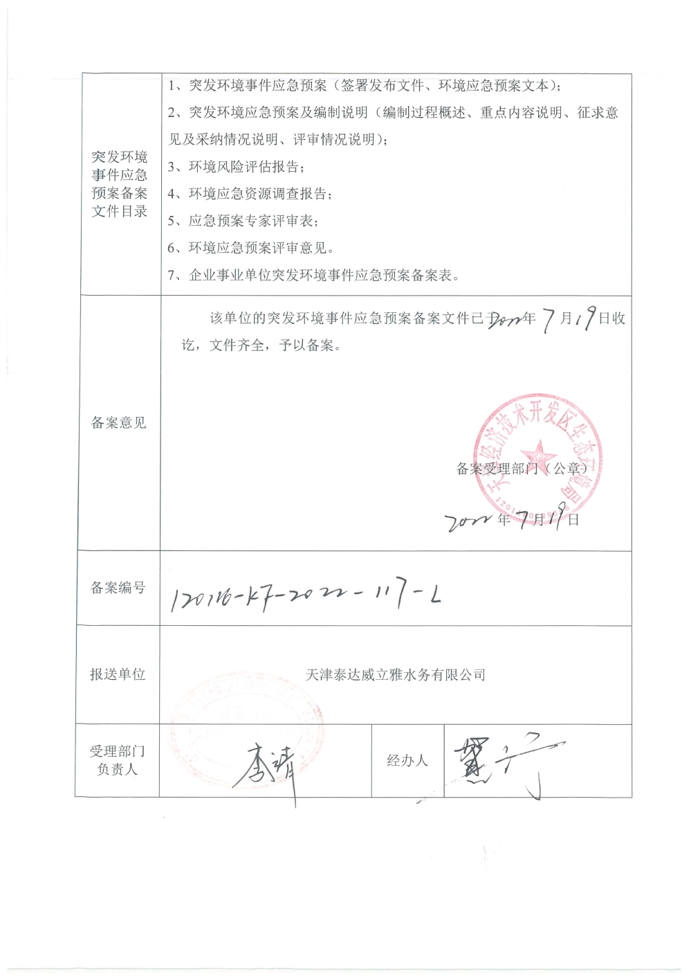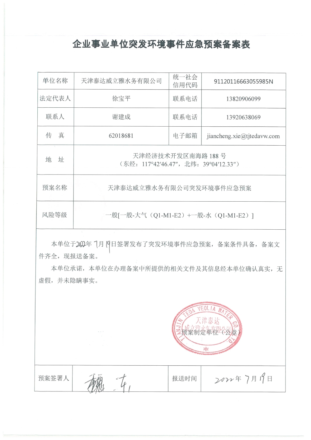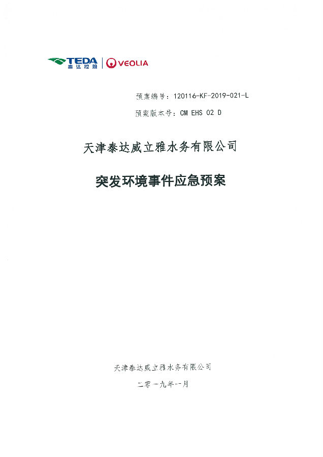 我公司根據《中華人民共和國環境保護法》以及《天津市突發事件總體應急預案》等相關文件要求,于2019年1月編制(修訂)完成了《天津泰達威立雅水務有限公司突發環境事件應急預案》,2022年7月19日完成變更備案并發布(備案編號:120116-KF-2022-117-L)。
